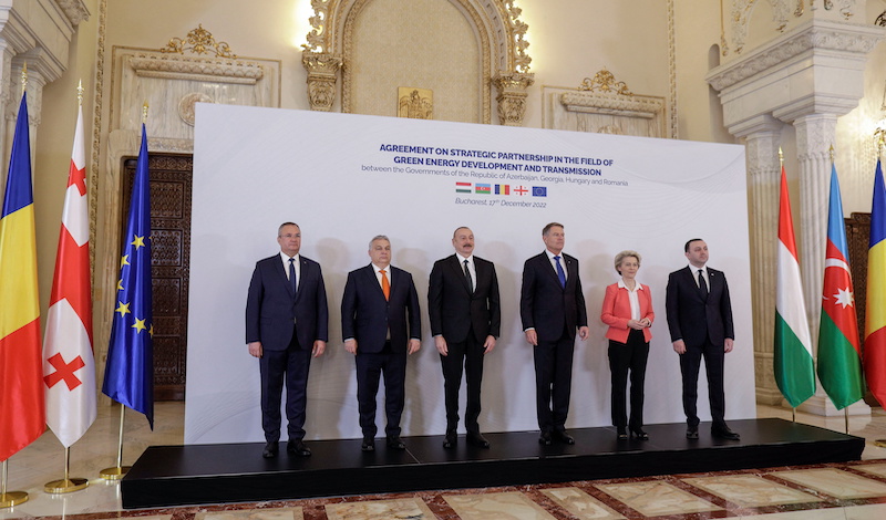 The leaders of Azerbaijan, Romania, Hungary and Georgia, and the European Commission President, at the signing of a green energy partnership in December 2022. (Photo: Inquam Photos/Octav Ganea via Reuters)