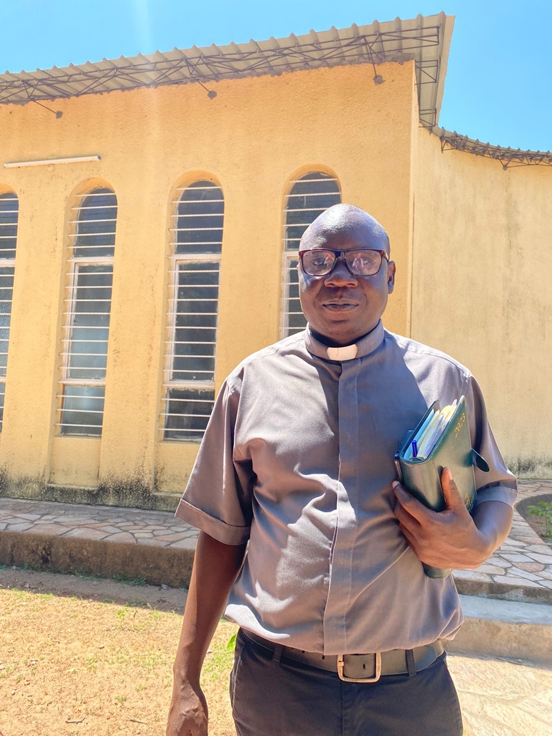 Reverend Christopher Dabu outside his church in Lusitu, Zambia (Photo: Joe Lo)