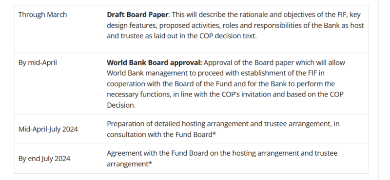 Timetable of steps the World Bank plans to undertake to become host of the new UN loss and damage fund (Source: World Bank)