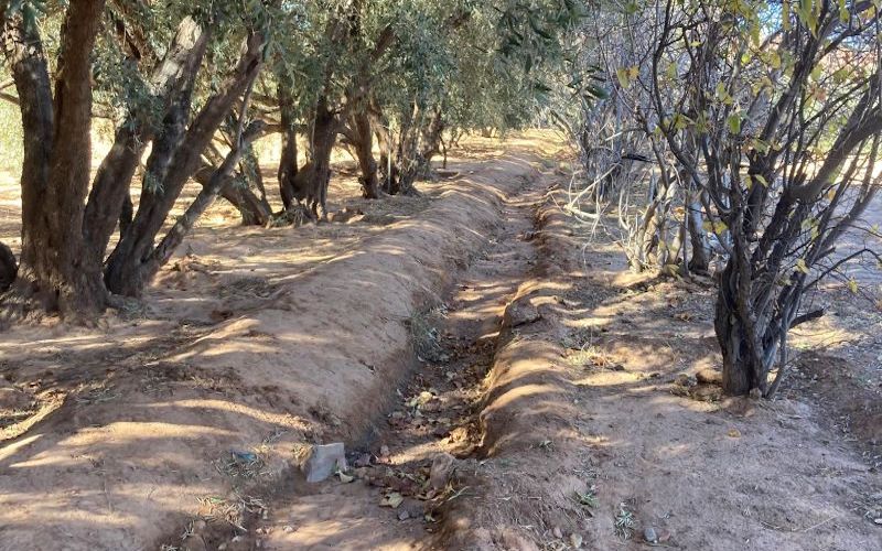 Among those affected is Mohammed Boumnir, a farmer in Imider who maintains his family’s plot of land, and harvests olives, dates, figs, grass, buckthorn, pomegranates, and radishes. The hand-dug canals of the khettara separate each set of crops like a lattice, but today they are bone dry. “This drought, the mining, it’s all affecting the farm. It’s cut off more than 80% of our water”, he told me.