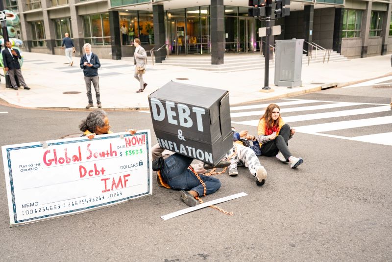Protesters gather outside the IMF and World Bank’s 2024 Spring Meeting in Washington D.C., on April 19, 2024. (Photo: Andrew Thomas/Sipa USA)